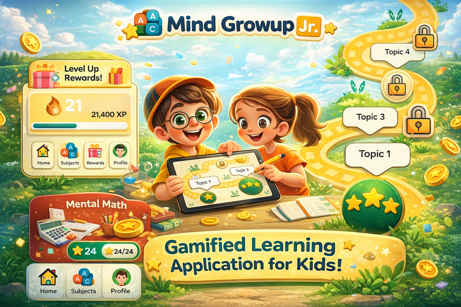 Gamified learning application for kids by Mind Growup Jr to enhance engagement, retention, and skill development through interactive digital experiences.
