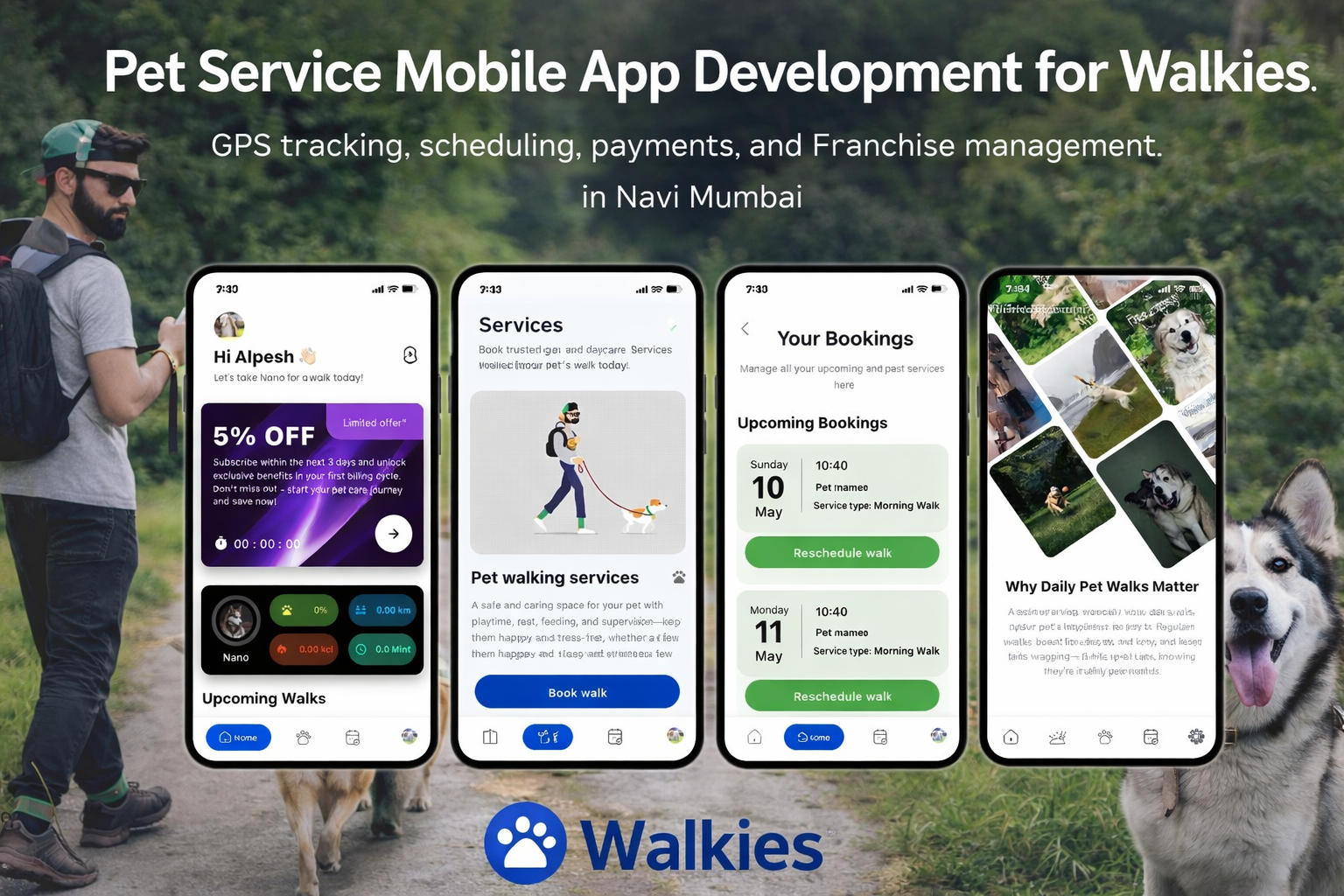 Pet Service Mobile App Development for Walkies World to enable GPS tracking, scheduling, payments, and franchise management in Navi Mumbai.
