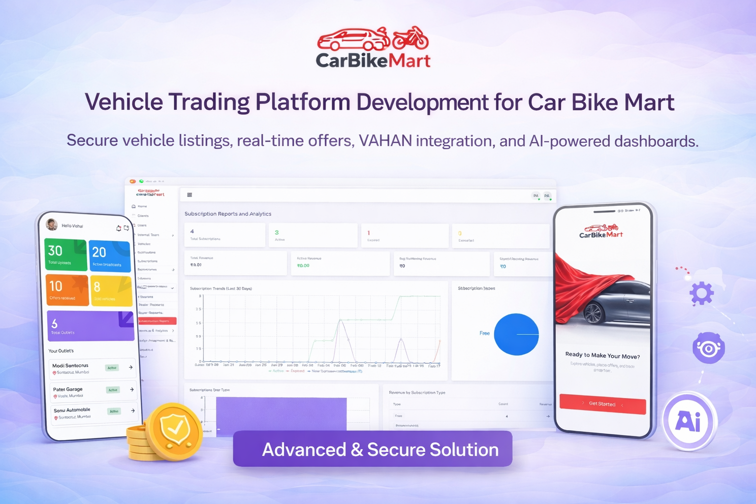 Vehicle Trading Platform Development for Car Bike Mart, enabling secure vehicle listings, real-time offers, VAHAN integration, and AI-powered dashboards.